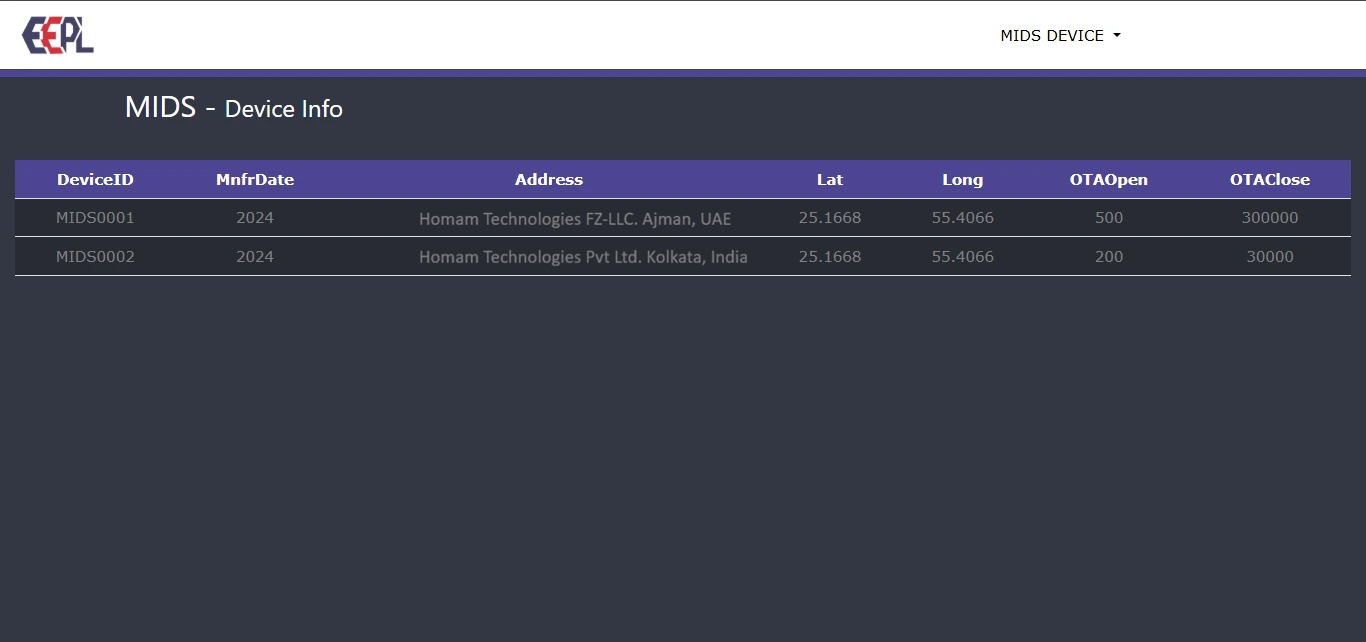 View and manage all registered devices, including location, manufacturing details, and OTA configuration in one centralized dashboard.